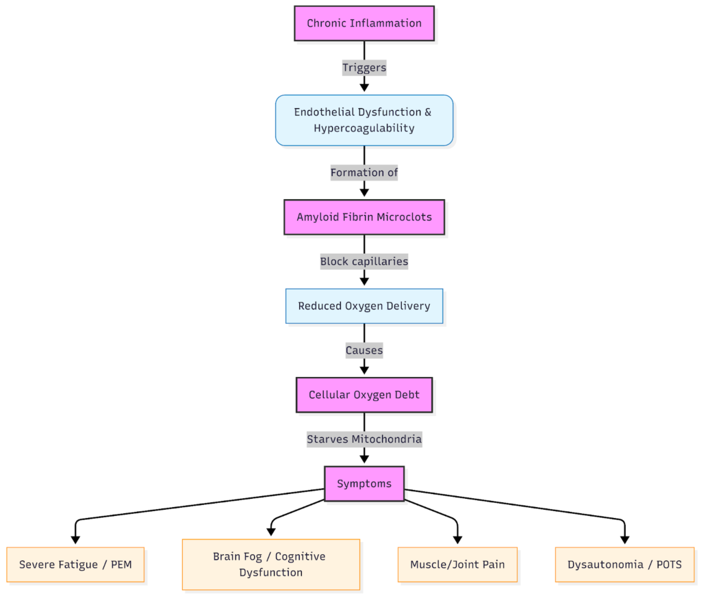 Exertion increases the body’s oxygen demand. When microclots and mitochondrial stress block supply, symptoms quickly escalate. This underlies post-exertional malaise (PEM) seen in both Long COVID and chronic fatigue-related conditions, where the body’s recovery systems simply can’t keep pace with energy use.